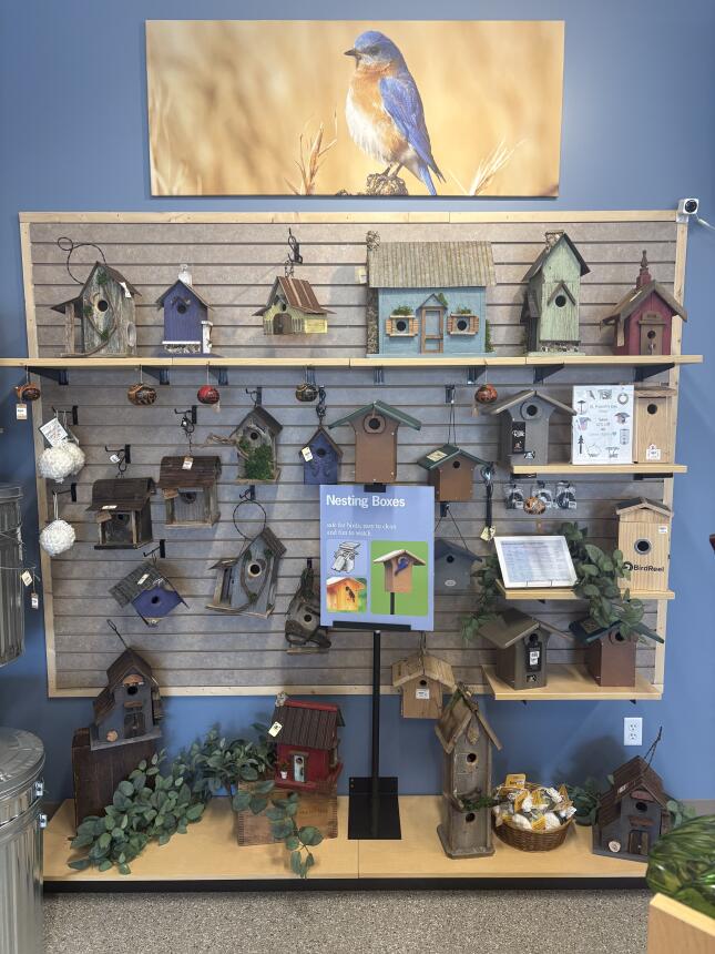 We offer a variety of nesting boxes in every color. Whether it's for your Bluebirds, Wrens or Chickadees, we are your one-stop shop! We can also provide placement advice to ensure the best nest-viewing experience. See our store(s) for details!