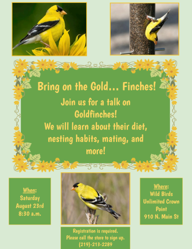Join us for our first in-store presentation in Crown Point! The topic is about American Goldfinches! Learn about their diet, nesting habits, mating, and more! All ages are welcomed; bring your friends, family, etc. for a great presentation at Wild Birds Unlimited. Snacks and drinks will be provided!