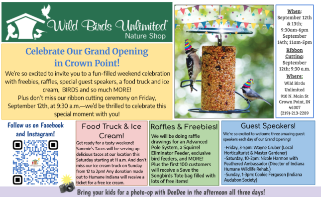Join us September 12-14th for TONS of fun activities, FREE WBU merchandise to the first 100 customers, food truck and ice cream, special guest speakers like Humane Indiana Wildlife with a feathered ambassador(s), raffle drawings for a chance to win cool prizes like free seed for a whole year* or an Advanced Pole System, and a photo-op with our famous Wild Birds Unlimited mascot, DeeDee!